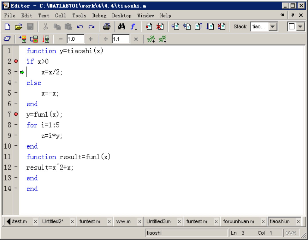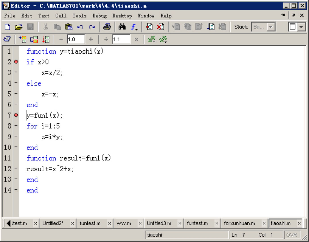 。本例中在函数文件的第2行和第7行设置了断点,如图4.11所示,断点语句前将有“小红点”标识。