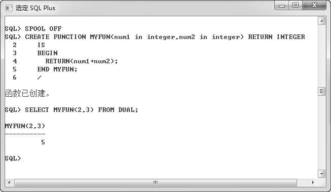在SQL*Plus中逐行编写以上脚本并执行,可以创建一个函数;利用查询语句可以调用该自定义函数。整个过程见图 2.36。