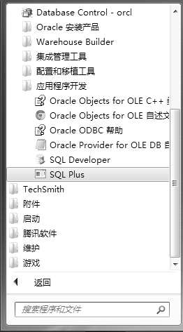 当确认Oracle数据库安装成功后,就可以利用SQL*Plus工具对数据库进行访问了。启动SQL*Plus的方法有多种,其中一种就是直接在【开始】菜单中单击【程序】→【Oracle-OraDb11g_home1】→【应用程序开发】→【SQL Plus】命令,如图 2.7 所示,即可进入SQL*Plus界面。