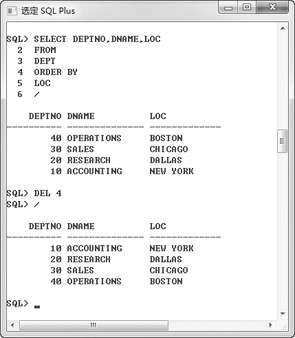 首先利用标准的查询列出了DEPT表中的数据,并按照“LOC”列进行排序;然后删除第 4 行,也就是“ORDER BY LOC”部分,利用“/”执行,读者可以发现,此时的查询,已经取消了按照“LOC”列进行排序。