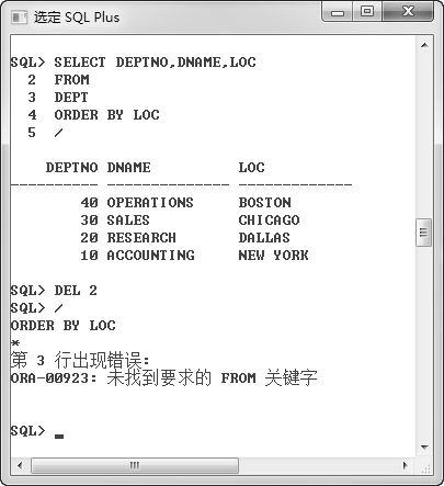首先利用标准查询列出了DEPT表中的数据,并按照“LOC”列进行排序;然后删除第 2 行到当前行(“ORDER BY LOC”);最后利用“/”执行,读者可以发现,此时的查询不能正常执行,提示没有FROM关键字。也就是说,删除命令执行成功,已经删除了第 2 行到第 4 行。