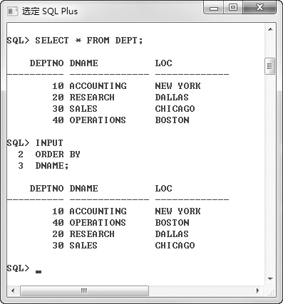 要求首先对DEPT表执行基本查询,然后利用INPUT命令对该查询追加排序子句。执行效果见图 2.11。