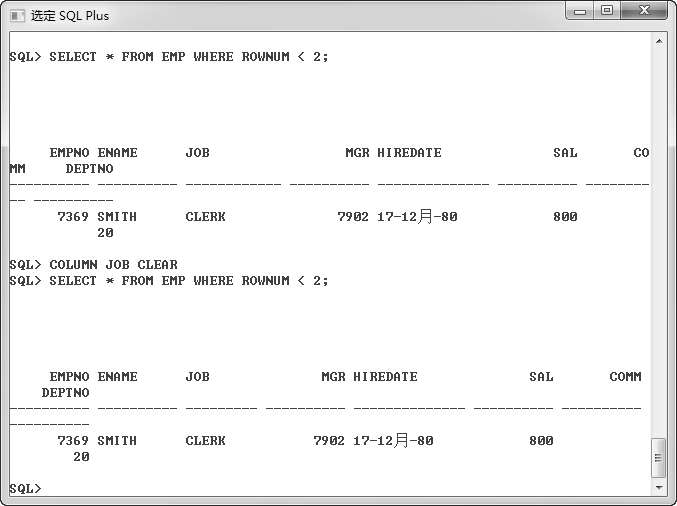 要求对EMP表中的JOB列进行格式化,格式化后的列显示长度为 12 个字符。具体操作步骤见图 2.28。