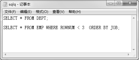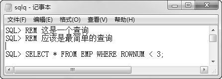 以上验证了SQL*Plus中如何使用该命令。读者还可以把这些命令写到记事本中,如图 2.35所示,然后在SQL*Plus中调用该记事本,查看执行效果,可以发现REMARK后面的语句被成功地注释掉了。