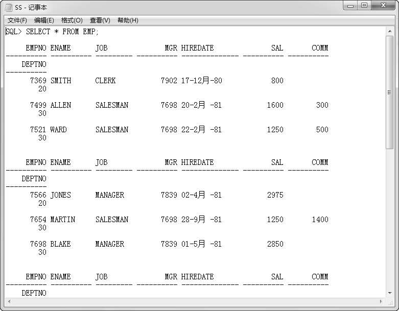 要求查询EMP表,并把查询结果存放到C盘的“ss.txt”中。操作步骤见图 2.30。