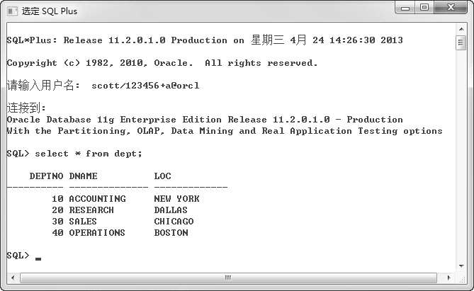 要求在SQL*Plus下,连接scott数据库实例,密码为“123456+a”,SID为“ORCL”,并查询该用户下DEPT表的数据。执行的连接脚本如下: