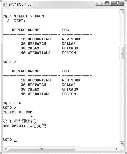 该实例首先分 2 行执行了一个查询命令,然后利用“/”重复执行上次执行的命令。读者可以发现,此时依然能够正常执行查询命令。当利用“DEL”命令删除当前行时,再次利用“/”执行查询命令,会发现提示“表名无效”的错误,说明“DEPT”这行已经被正常删除。