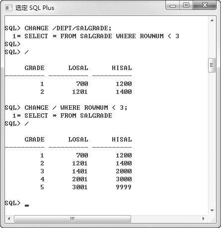 要求首先查询DEPT表的前 2 条数据,然后利用CHANGE命令改为查询SALGRADE表的前 2条数据,执行效果见图 2.12。最后利用CHANGE命令去掉查询记录数限制,查询SALGRADE表的所有记录,执行效果见图 2.13。