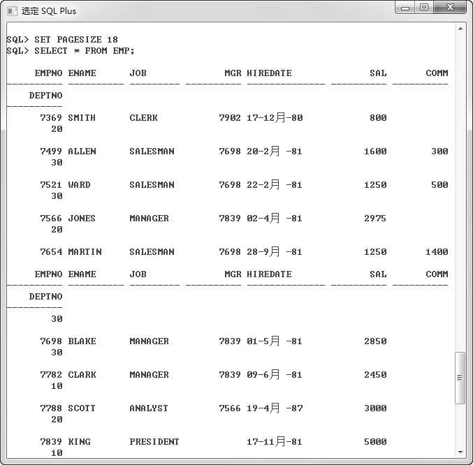 要求使用命令设置每页显示的记录行数,然后查询EMP表中的数据。操作步骤可以参考图2.24。
