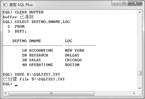 要求首先清除缓冲区的内容,然后查询DEPT表的数据,最后利用SAVE命令保存当前缓冲区的内容。操作步骤见图2.22。当执行SAVE命令后,会在D盘下创建一个名为“sqltest.txt”的文件,打开后可以查看缓冲区的内容。