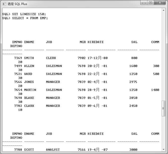 这是EMP表的查询结果,可以看到,在查询结果列表中,列出现了自动换行的情况,导致了阅读不方便。这是一个很常见的问题,所以,在使用SQL*Plus时,在很多情况下都需要使用者对查询结果进行格式化。下面介绍几种常用的格式化输出结果的命令。