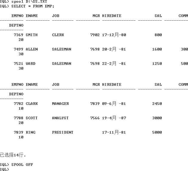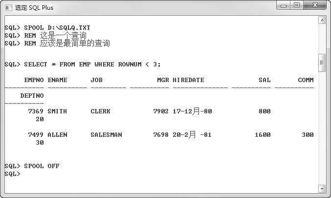 很多时候开发人员会把查询结果保存到文件中,在SQL*Plus中读者可以使用“SPOOL”命令来完成这项操作。其语法结构如下: