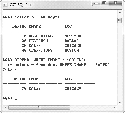 执行效果见图 2.9,图中列出了DEPT表中的所有记录。在该语句后面追加WHERE条件语句,只把DNAME为“SALES”的记录查询出来。整个操作过程见图 2.10。