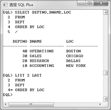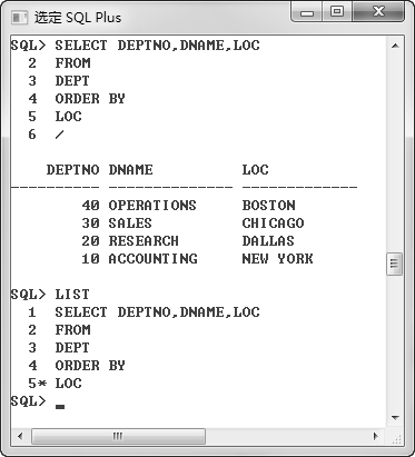 首先利用标准的查询列出了DEPT表中的数据,并按照“LOC”列进行排序;然后删除第 4 行,也就是“ORDER BY LOC”部分,利用“/”执行,读者可以发现,此时的查询,已经取消了按照“LOC”列进行排序。