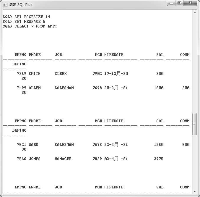 要求利用命令设置每页显示的记录行数,然后设置两页之间的行数,最后查询EMP表中的数据。操作步骤可以参考图 2.25。
