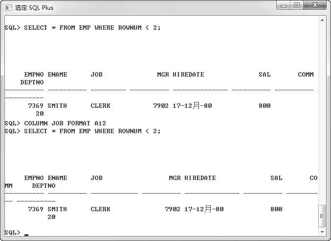要求对EMP表中的JOB列进行格式化,格式化后的列显示长度为 12 个字符。具体操作步骤见图 2.28。