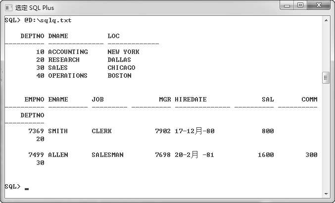 下面在SQL*Plus中调用“sqlq.txt”文件,该文件可以是“*.sql”类型,调用过程见图 2.33。