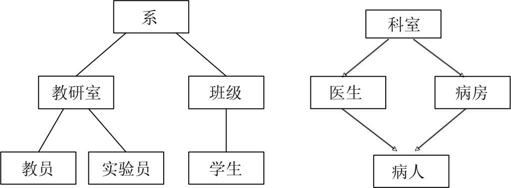 层次模型和网状模型数据库系统也称为第一代数据库,其先驱是 1969 年IBM提出的层次数据库模型。该数据库系统以有向图为基础,一次存取一条记录,采用的是过程化的存取方法。简单的层次模型和网状模型数据库系统存储的数据结构如图 1.3 所示。
