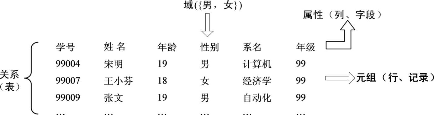 关系模型与以往的模型不同,它是建立在严格的数学概念基础上的。在用户看来,关系模型中数据的逻辑结构是一个二维表,它由行和列组成。现以图 1.4 所示的学生登记表为例,简单介绍一下关系模型中的一些术语。