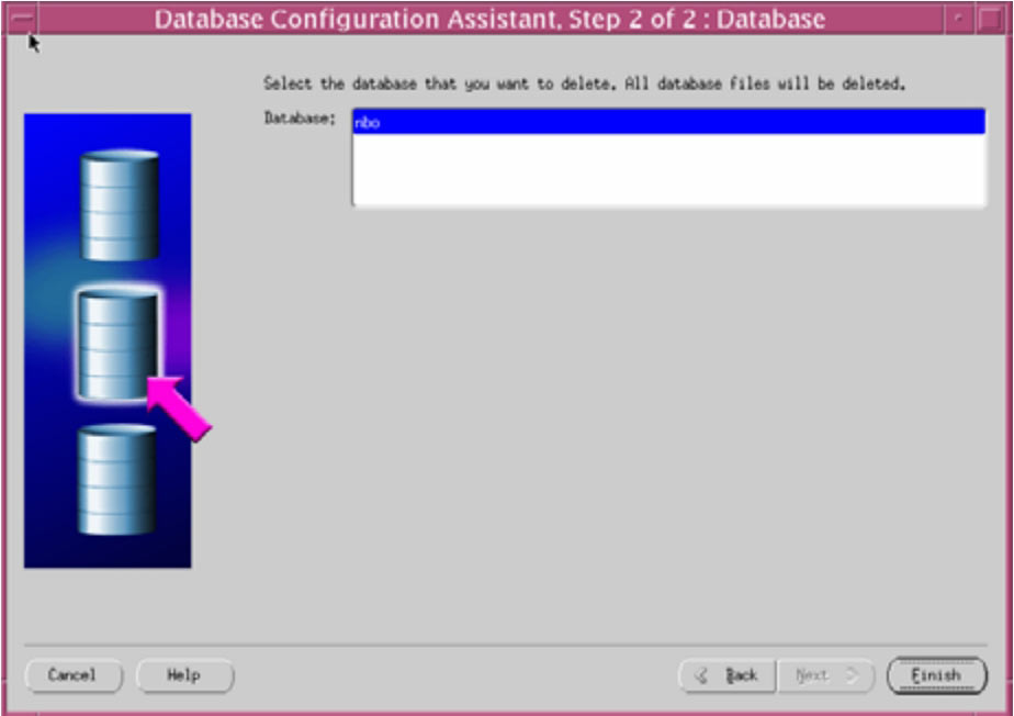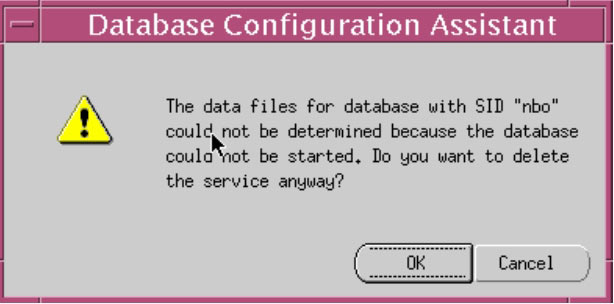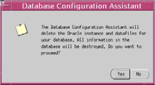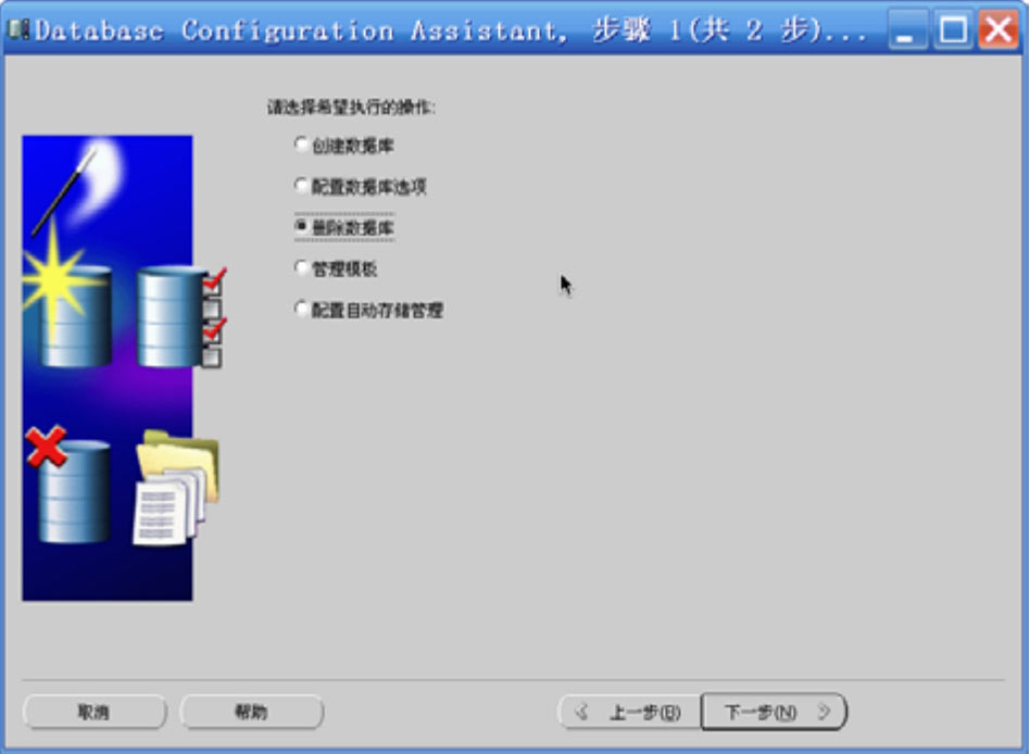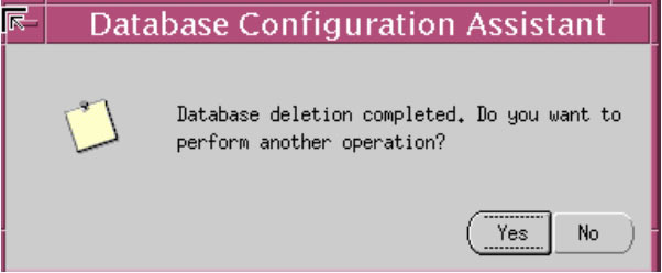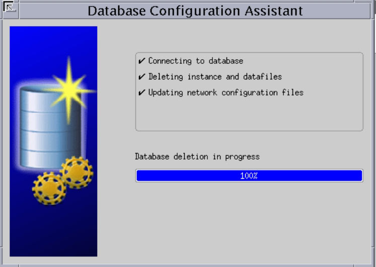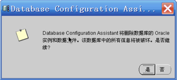 【小贴士(Tip)】 在许多情况下,当我们要删除数据库的时候,数据库可能已经遭到破坏。使用DBCA,并不一定能够成功删除数据库。但是,不论数据库处于何种状态,还是推荐用DBCA首先执行一遍删除数据库的操作。即使用DBCA删除数据库不成功,也不影响我们成功卸载数据库,我们也应该继续下面的操作。