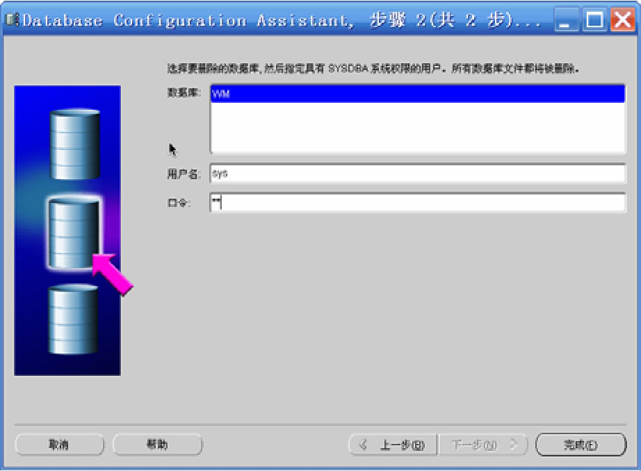 选择要删除的数据库,如图2-115所示,输入具有SYSDBA系统权限的用户名及密码。