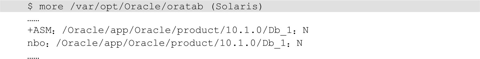 从输出可以看出,系统中有两个实例:一个ASM实例(Automatic Storage Manager instance),一个数据库实例nbo(nbo是本书中的例子)。这里也同时标识出Oracle的主目录。/Oracle/app/Oracle/product/10.1.0/Db_1是Oracle的主目录。