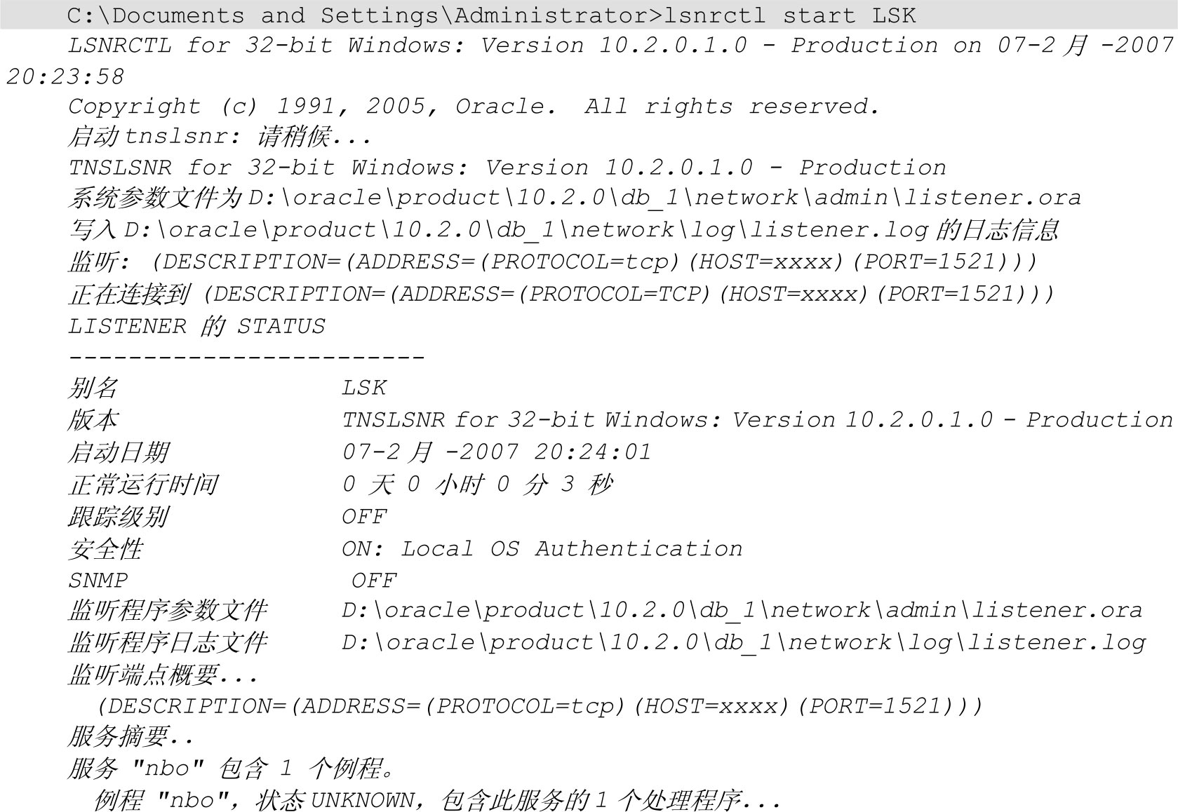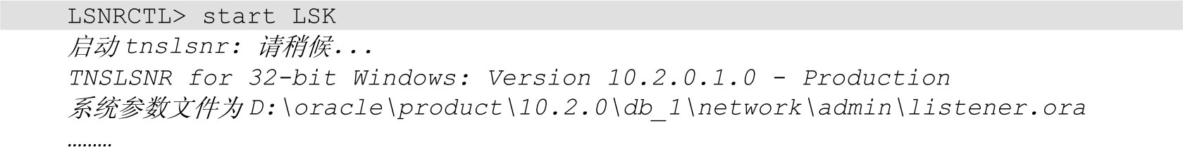 其中,LSK是监听器的名称。如果执行lsnrctl start命令(没有指定监听器的名称),则该命令将启动默认的监听器。默认的监听器的名称是LISTENER。