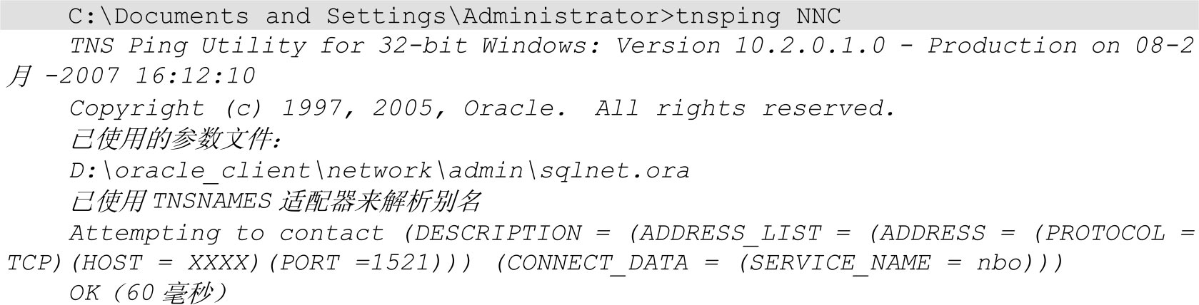 如上面所示,如果客户端能够成功连接到服务器,tnsping命令的执行结果将会显示“OK”,并报告这个过程消耗了多少时间(本例中消耗60ms);如果不能成功连接到远程的服务器,则tnsping命令将会返回详细的错误信息。