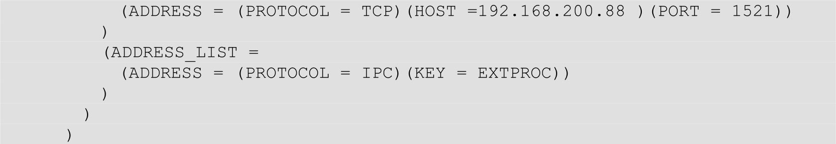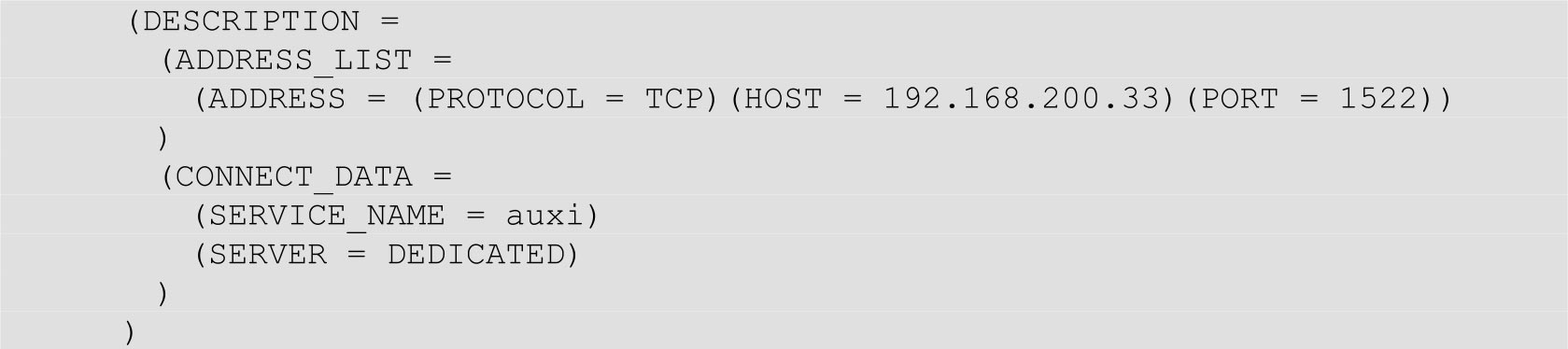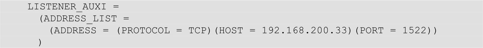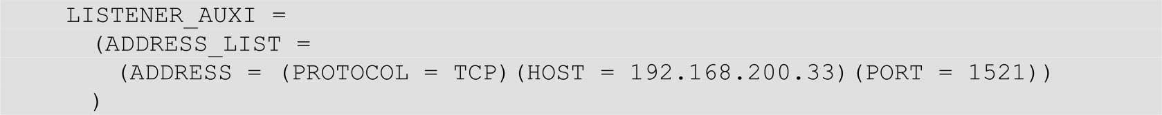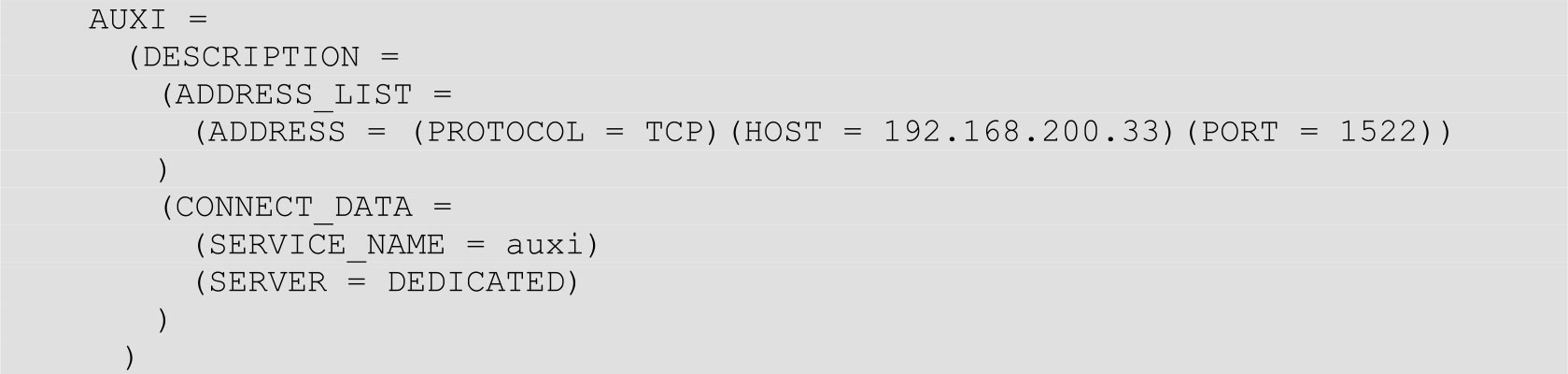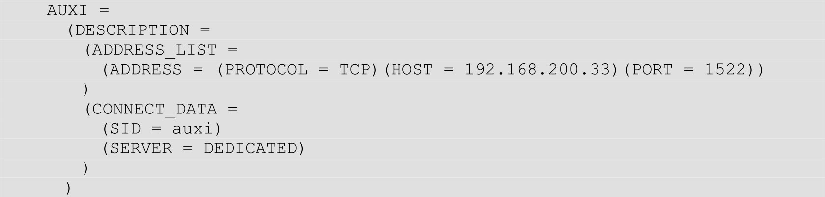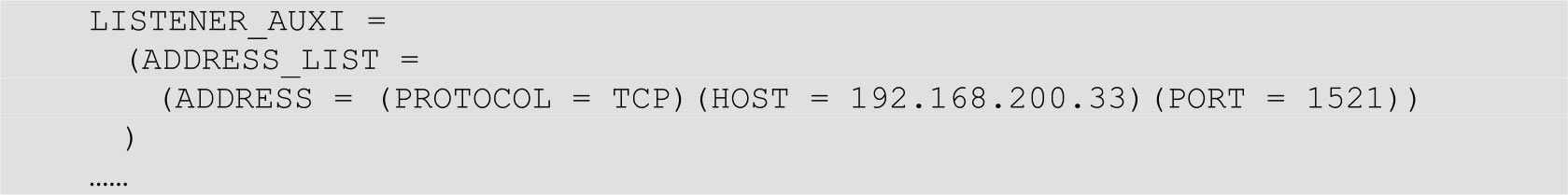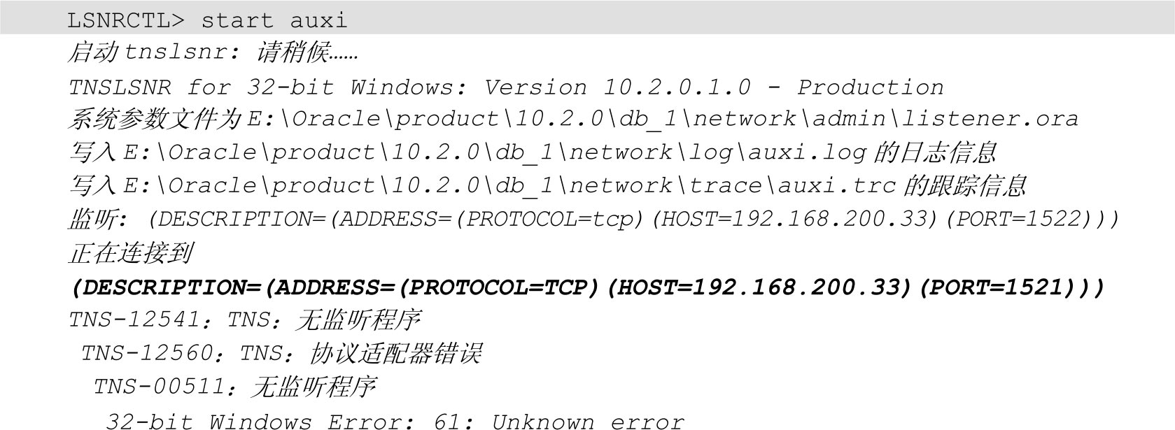 这使得服务名LISTENER_AUXI所引用的端口号和服务器端监听器的端口号(1522)相同。同时,LISTENER_AUXI所引用的主机地址也必须和监听器的主机地址相同。