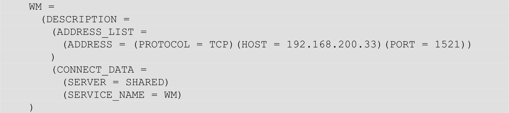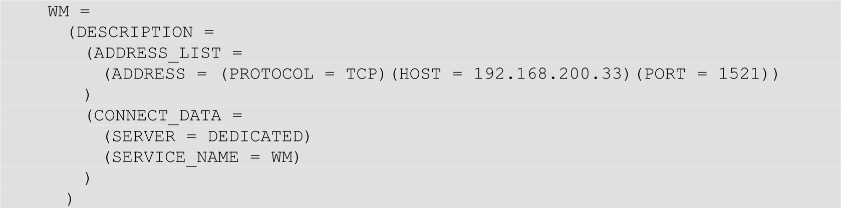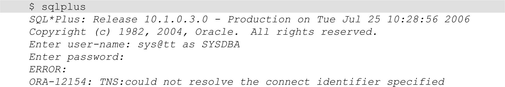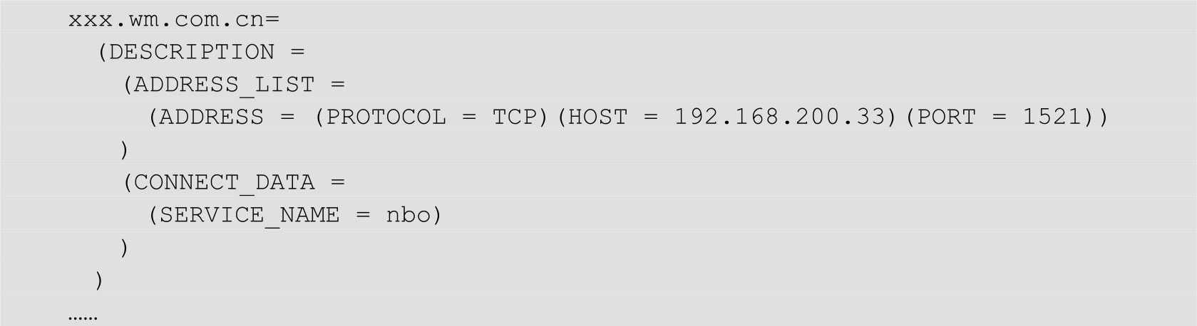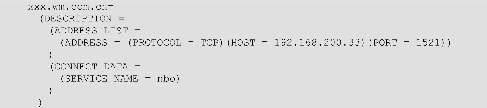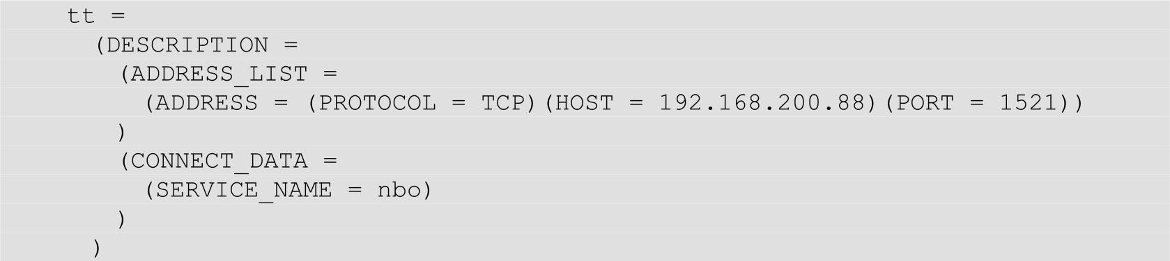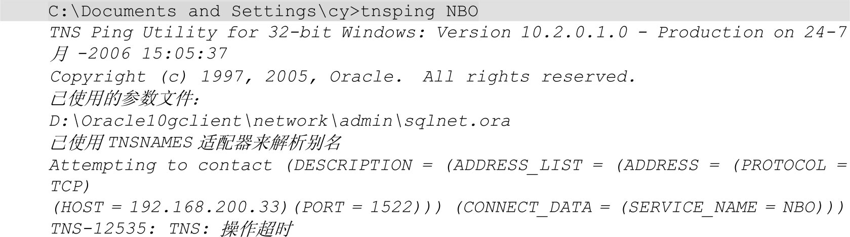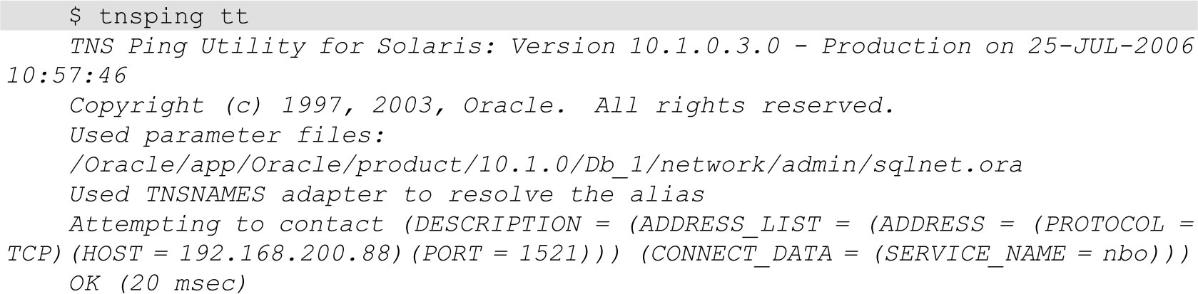 tnsping命令会通过文件tnsnames.ora解析tt,从这个文件获得要目标的IP(HOST=192.168.200.88)、实例名(SERVICE_NAME=nbo)、端口号(PORT=1521),然后向监听器发出请求。如果成功,则在最后会返回类似于“OK(20 msec)”的信息,“OK”表示请求成功,20 msec表示整个过程耗费了20ms。如果客户端配置不当,则会返回其他错误信息。
