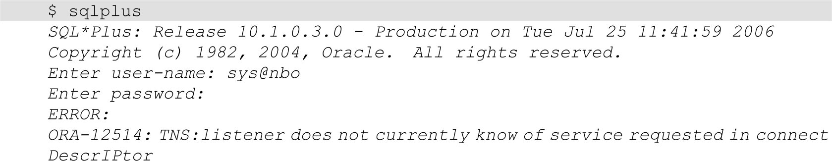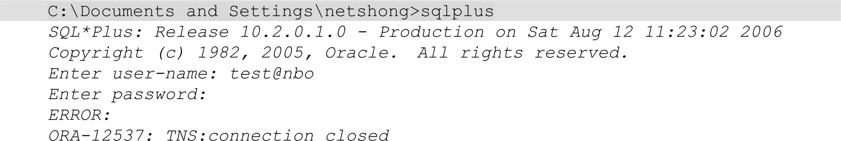 本例中,产生TNS-03505错误,是由于我们使用了错误(或不存在)的网络服务名(Net Service Name)所造成的。本例中,bss是不存在的网络服务名(Net Service Name)。