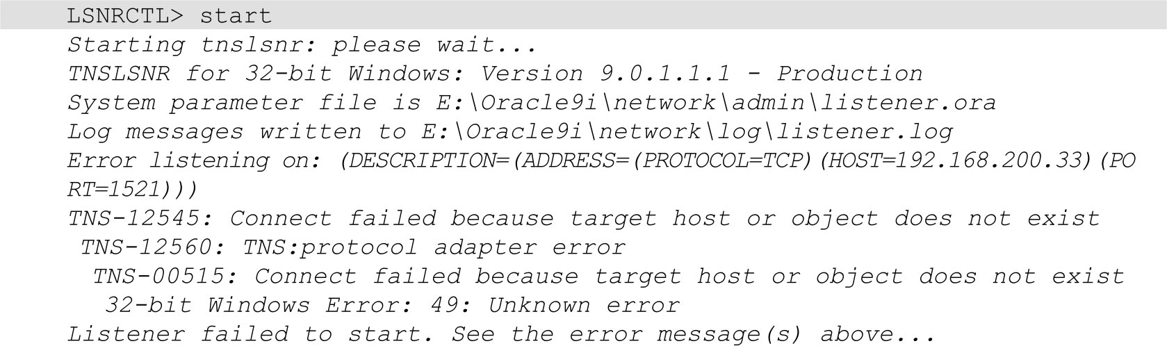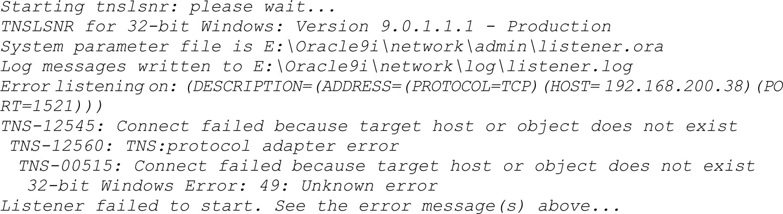在数据库服务器端启动监听器时,报告错误TNS-12545,具体过程如下:
