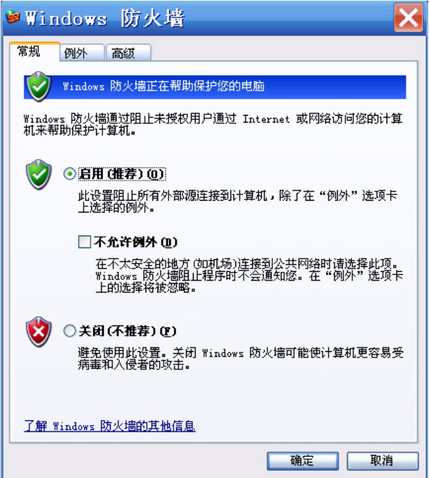 单击“Windows防火墙”,出现如图4-37所示的界面。在防火墙的“常规”