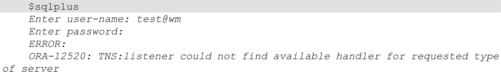 启动SQL*Plus,使用网络服务名AUXI登录数据库时,报告错误“ORA-12523:TNS:listener could not find instance appropriate for the client connection”。