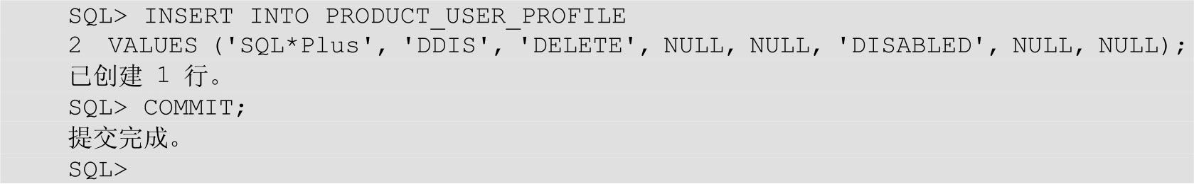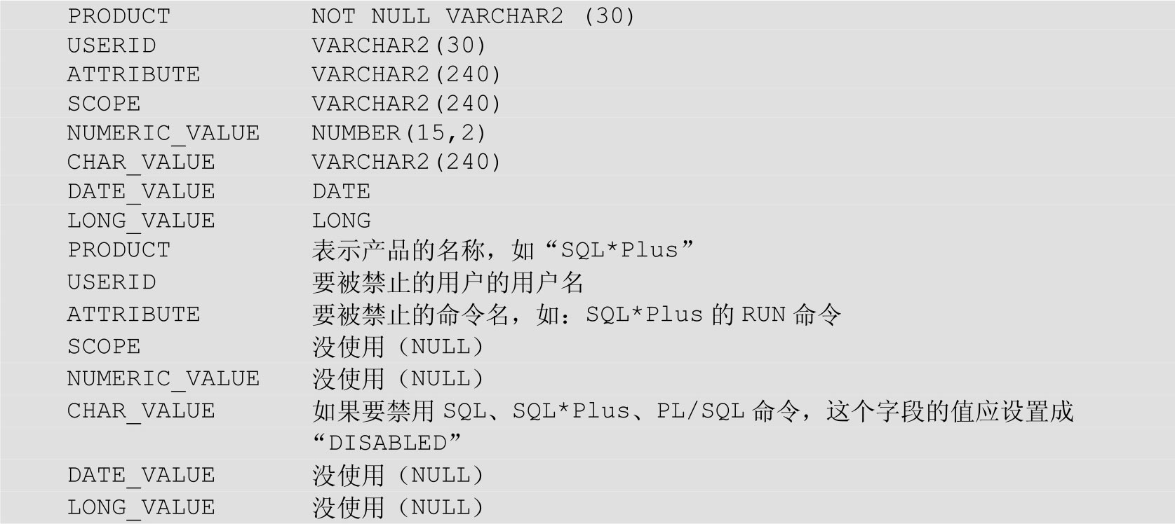 要想禁止某个用户执行某个命令,我们只需往数据库用户SYSTEM的表PRODUCT_USER_PROFILE中插入一条记录,PRODUCT_USER_PROFILE表的结构如下: