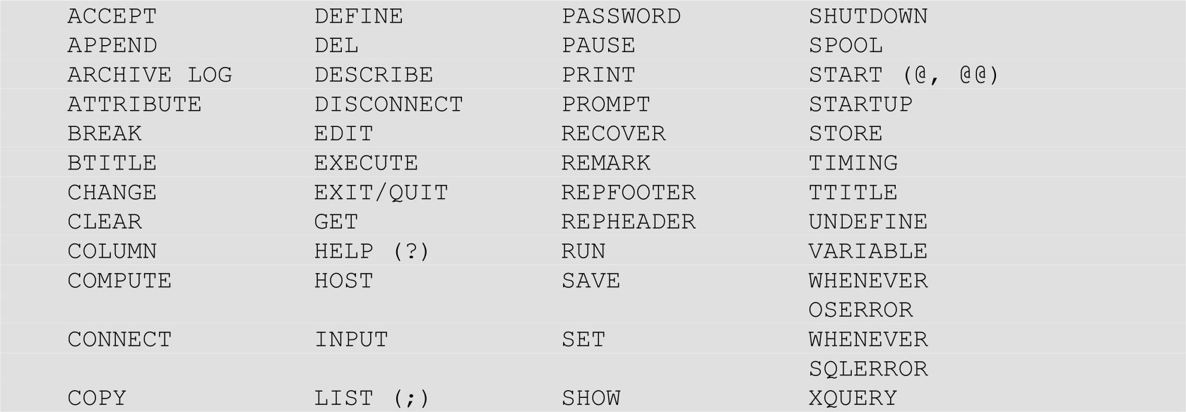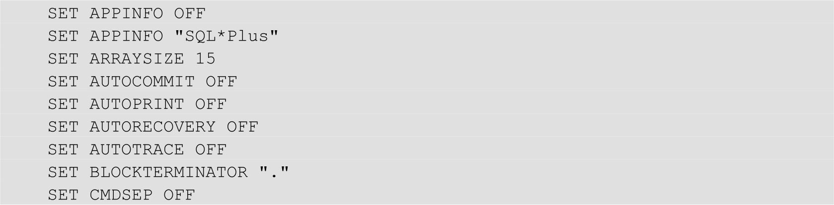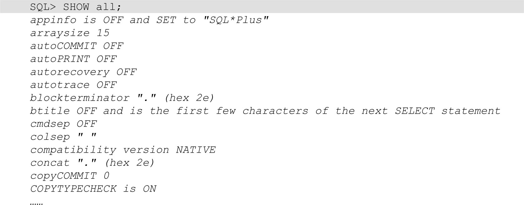 【小贴士(Tip)】 SQL*Plus的环境变量是客户端SQL*Plus的环境变量,它控制SQL*Plus的行为,对数据库服务器没有任何影响。SQL*Plus的环境变量、操作系统的环境变量、Oracle的初始化参数是截然不同的概念。