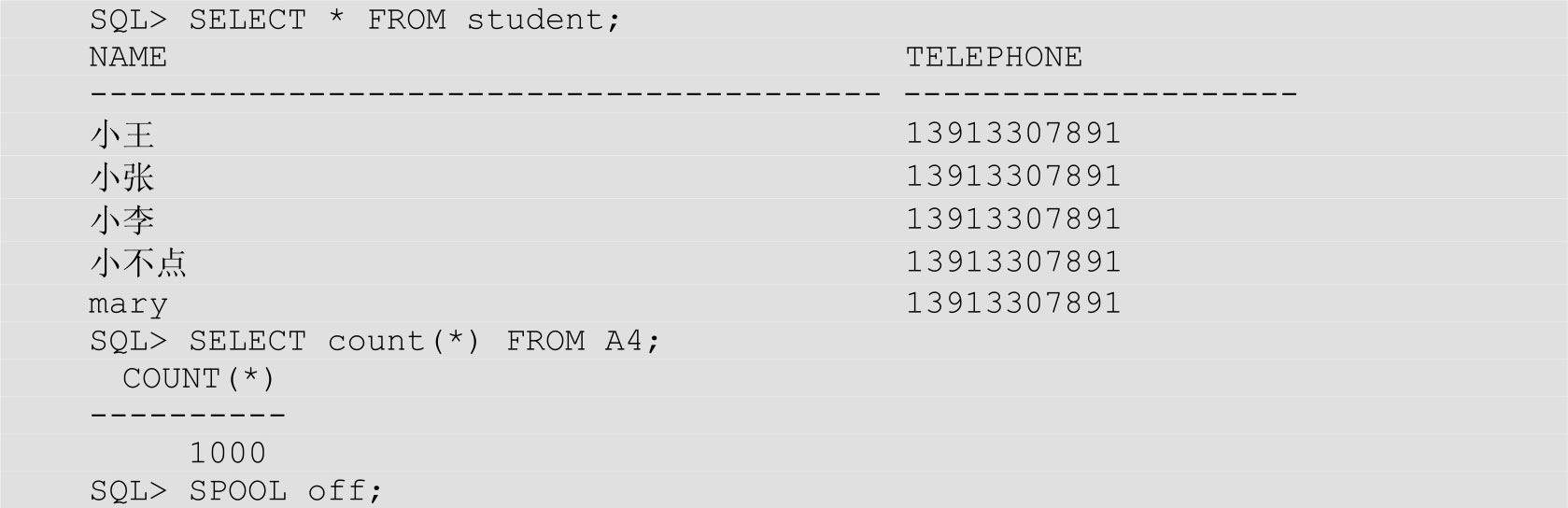 执行SPOOL off命令,该命令用来终止向文件sptest.txt中写入查询的结果。也就是说,从这里开始,不再向sptest.txt中写入任何东西。