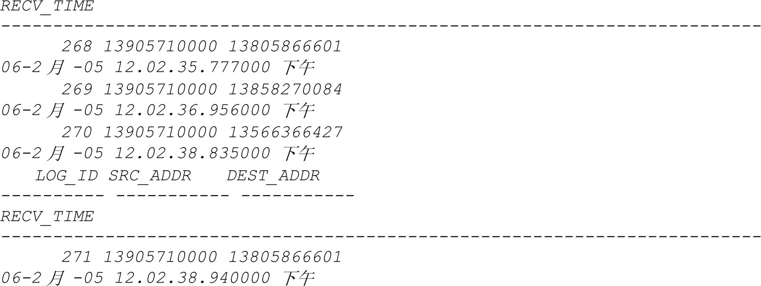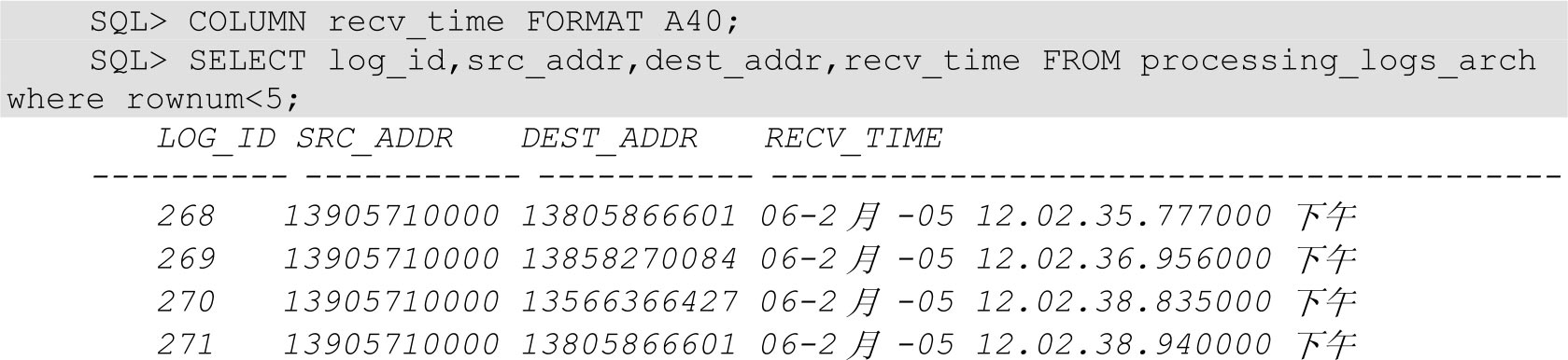 其中,COLUMN是SQL*Plus专有命令,recv_time是要格式化的列,FORMAT也是关键字,表示要对列的输出进行格式化,A40表示列的输出被限制为40个字符,A表示字符。