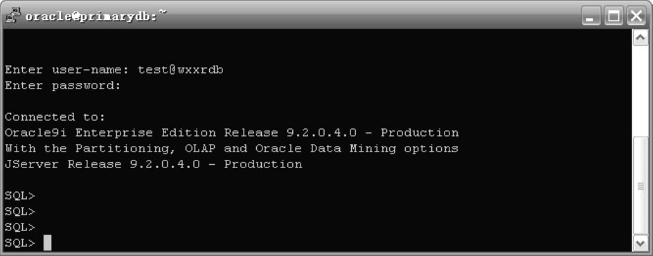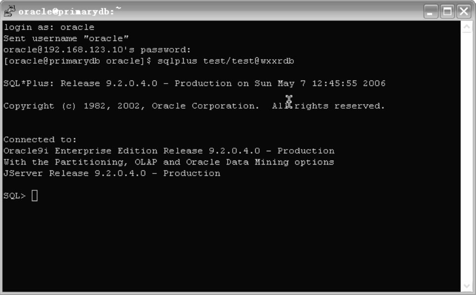 在Linux的命令行提示符下输入:sqlplus test/test@wxxrdb,按回车键,登录成功后,出现如图5-10所示的窗口。其中,sqlplus是启动SQL*Plus的命令,第一个test是用户名,第二个test是密码,@wxxrdb表示要登录到的数据库是wxxrdb。wxxrdb是网络服务名(Net Service Name)。
