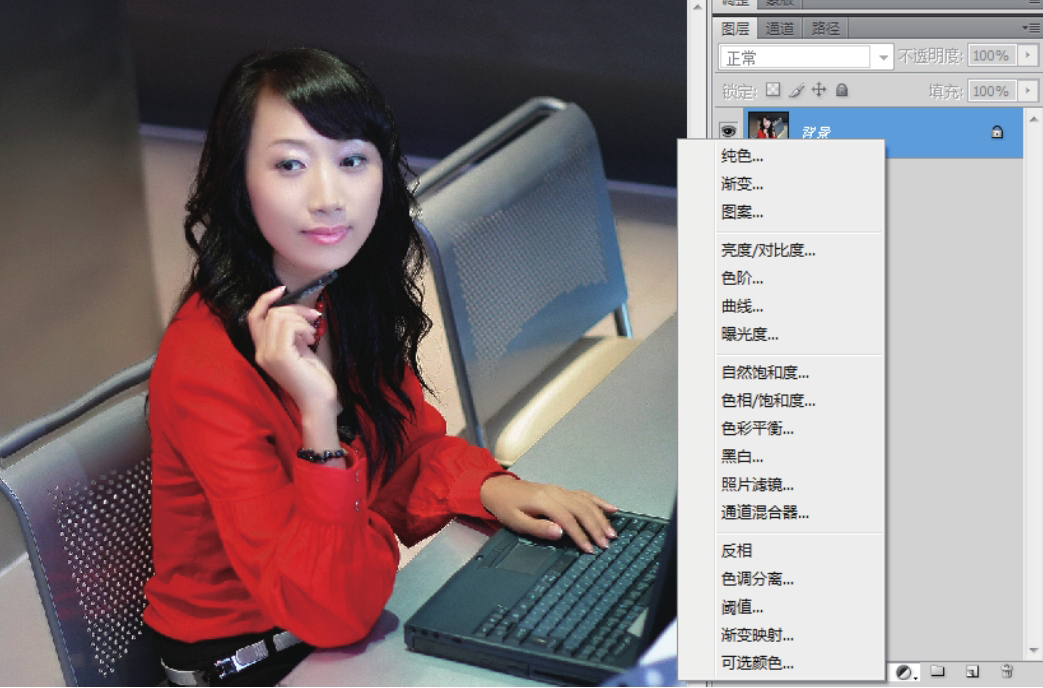 02 打开“图层”面板,单击面板底部的“创建新的填充或调整图层”按钮,在弹出的菜单中选择【可选颜色】命令,如图4-11所示。