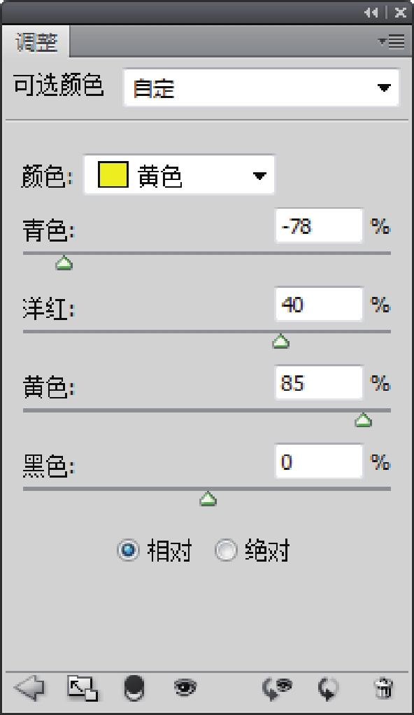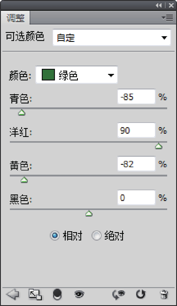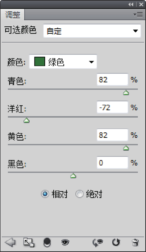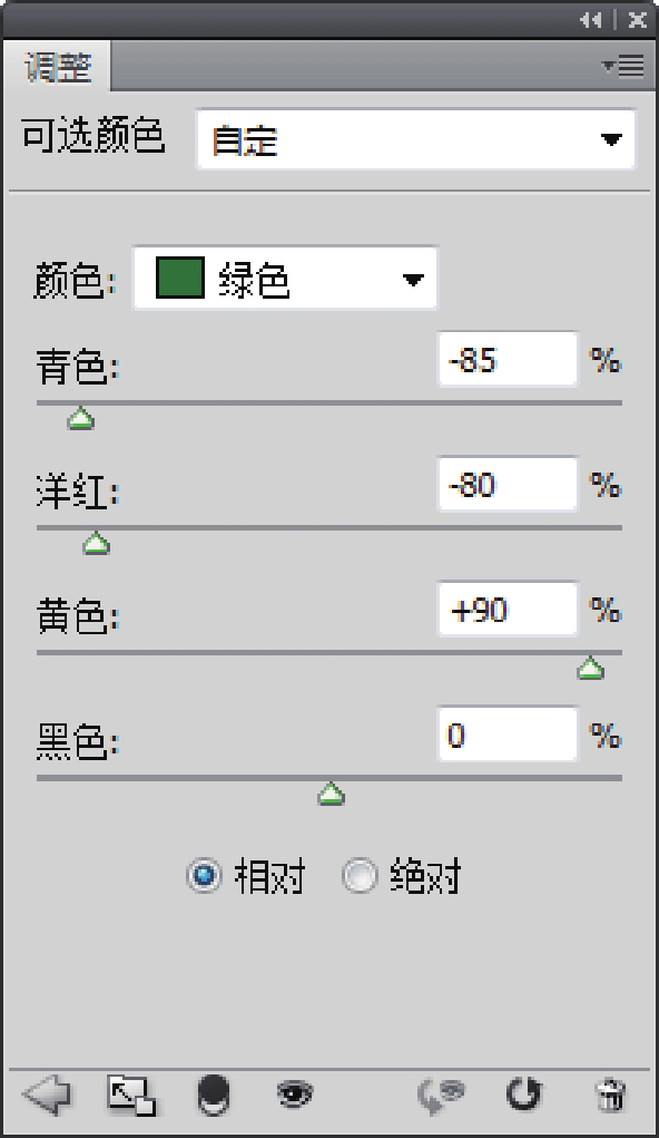 第一步:减少绿色。要减少绿色,根据色相轮,我们要增加绿色的互补色——洋红。减少青色,减少黄色,由于是调整黄色,所以黄色可以保持不变。