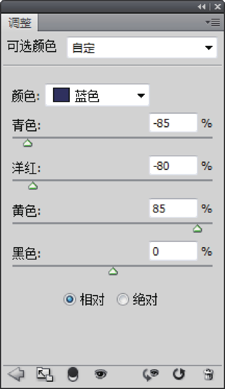 03 打开“可选颜色”对话框,选择蓝色,分别调节青色、洋红、黄色数值,如图4-20所示,减少蓝色后得到的最终效果如图4-21所示。