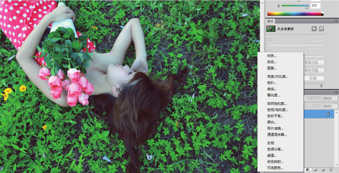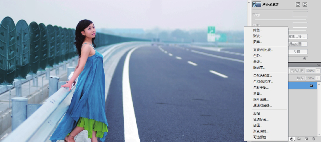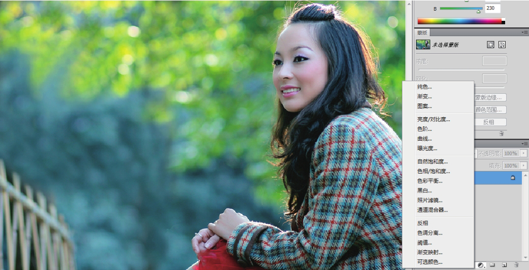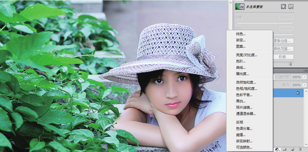 02 打开“图层”面板,单击“图层”面板底部的“创建新的填充或调整图层”按钮,在弹出的菜单中选择【可选颜色】命令,如图4-23所示。