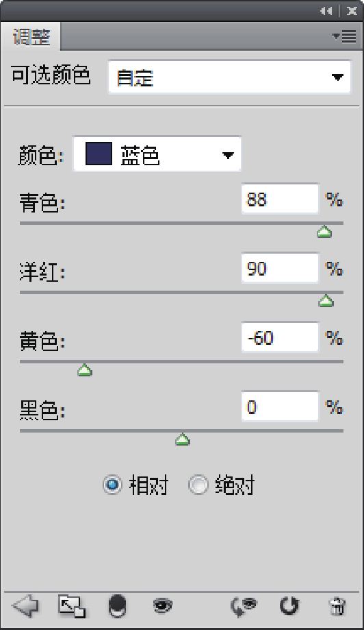 03 打开“可选颜色”对话框,选择蓝色,然后调节青色、洋红、黄色数值,如图4-24所示,增加蓝色后得到的最终效果如图4-25所示。