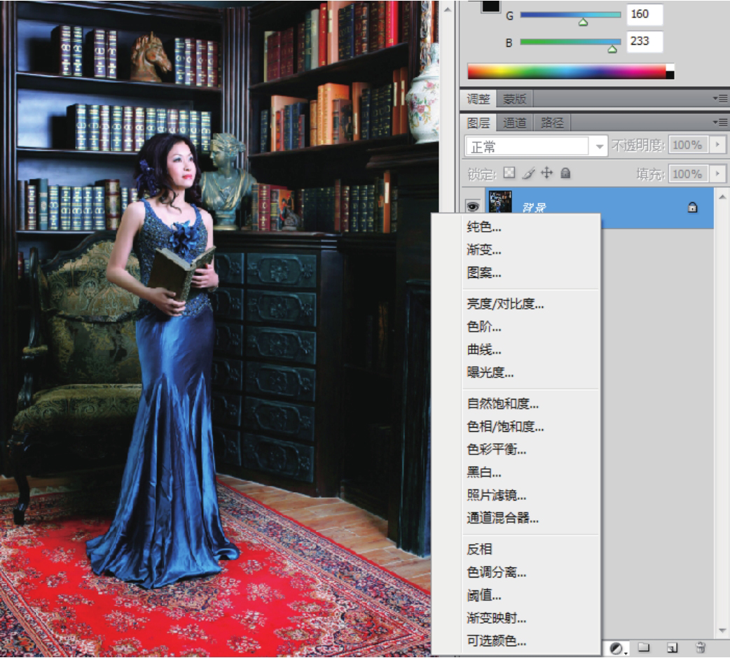 02 打开“图层”面板,单击面板底部的“创建新的填充或调整图层”按钮,在弹出的菜单中选择【可选颜色】命令,如图4-19所示。