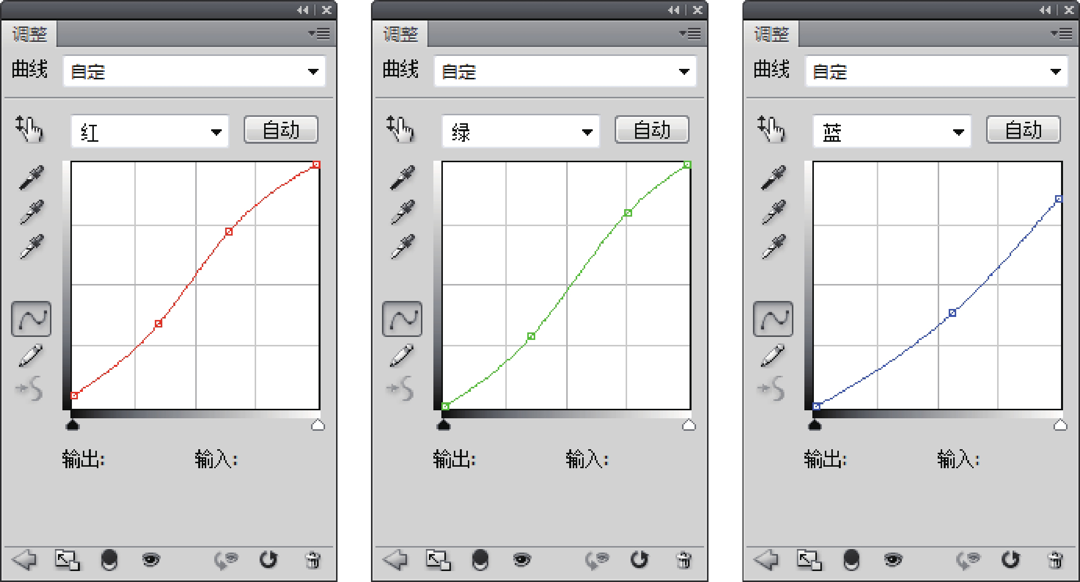 03 打开“曲线”对话框,分别对红、绿、蓝通道进行调节,如图4-37所示,调节后的效果如图4-38所示。
