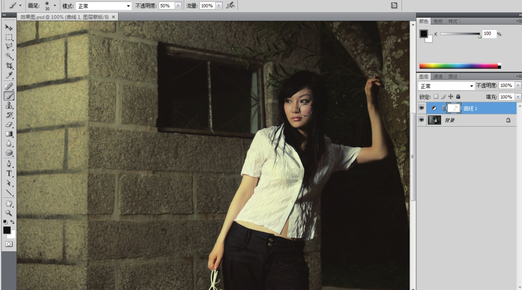 04 调节完毕后,发现人像脸部过黄,需要适当进行还原。设置前景色为黑色,在工具箱中选择画笔工具,设置画笔大小为30,不透明度为50%,涂抹人物脸部,如图4-39所示,涂抹后的最终效果如图4-40所示。