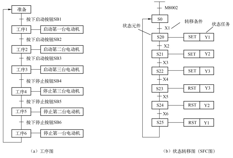 图5-1是一种三台电动机顺序控制图,由于每一个步骤称作一个工艺,所以又称工序图。在PLC编程时,绘制的顺序控制图称为状态转移图,简称SFC图,图5-1(b)为图5-1(a)对应的状态转移图。