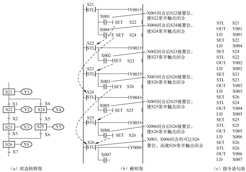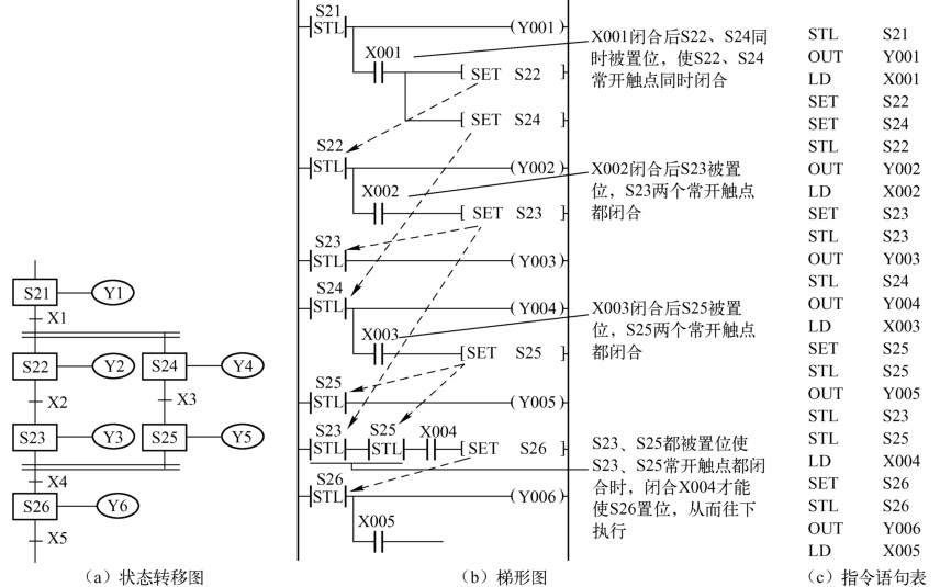 并行分支方式状态转移图如图5-5(a)所示,在状态器S21后有两个并行的分支,并行分支用双线表示,当X1闭合时S22和S24两个分支同时执行,当两个分支都执行完成并且X4闭合时才能往下执行,若S23或S25任一条分支未执行完,即使X4闭合,也不会执行到S26。图5-5(b)是依据图5-5(a)画出的梯形图,图5-5(c)则为对应的指令语句表。