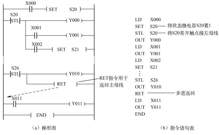 RET指令使用举例如图5-3 所示,其中图(a)梯形图,图(b)为对应的指令语句表。RET指令通常用在一系列步进指令的最后,表示状态流程的结束并返回主母线。